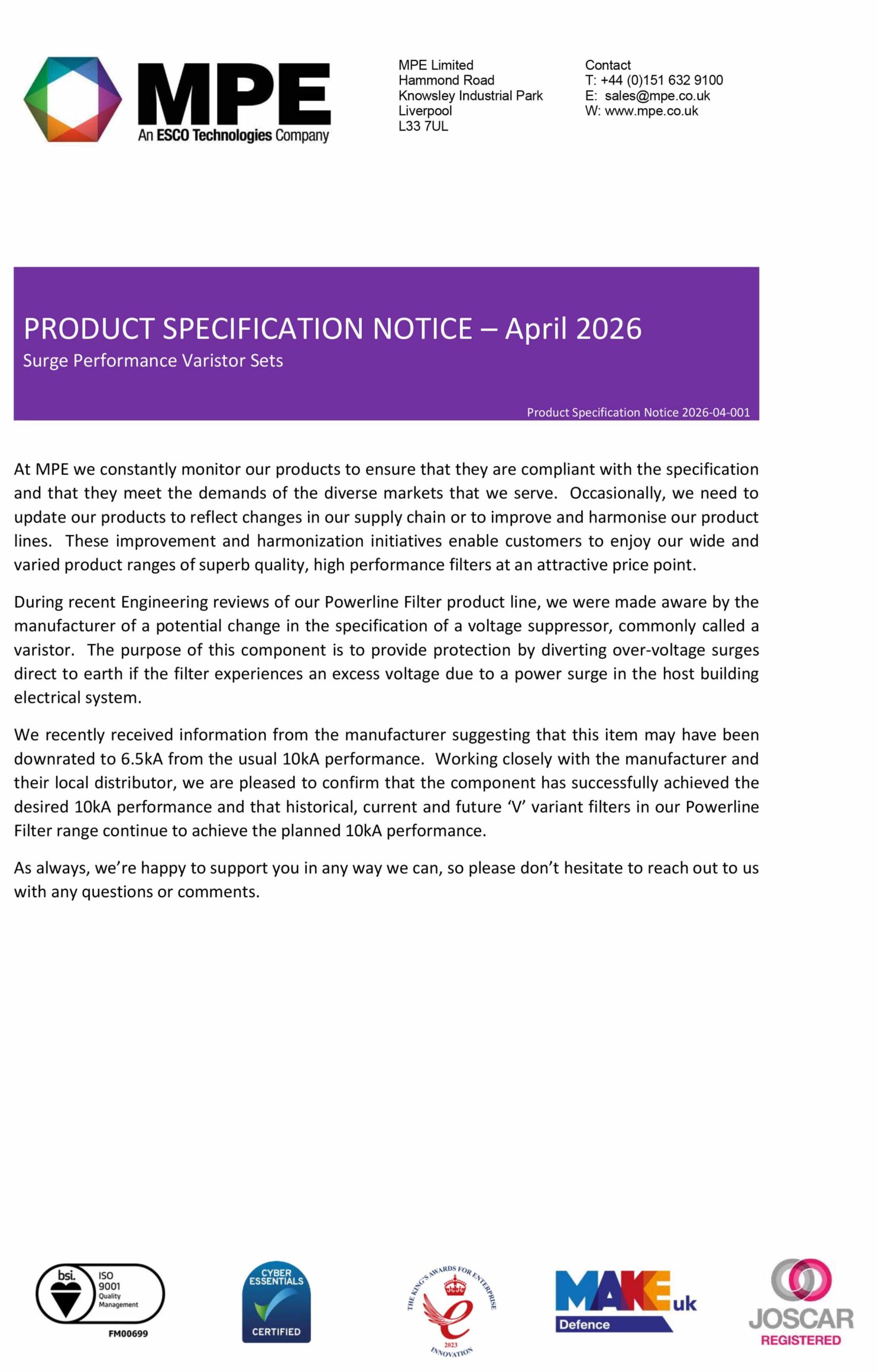 MPE Product Specification Notice - April 2026 (Download File)